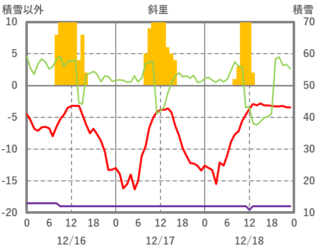 | 日 | 時 | 気温 | 降水 | 風向/風速 | 日照 | 積雪 | 降雪 |