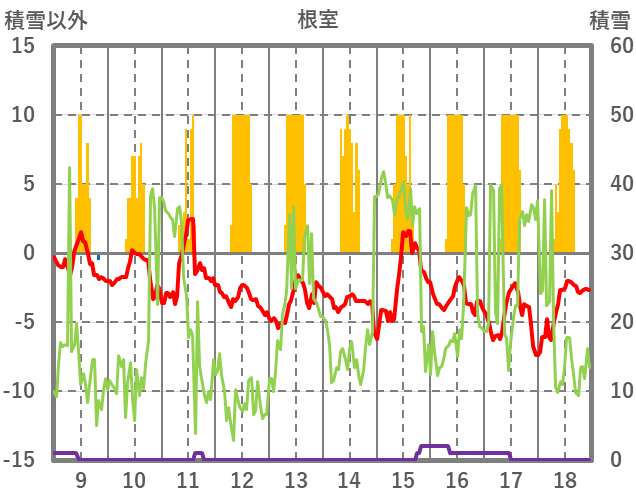 | 日 | 時 | 気温 | 降水 | 風向/風速 | 日照 | 積雪 | 降雪 |