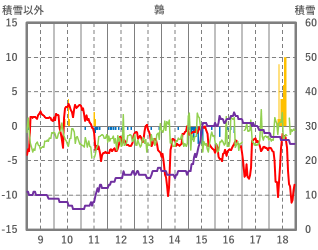 | 日 | 時 | 気温 | 降水 | 風向/風速 | 日照 | 積雪 | 降雪 |
