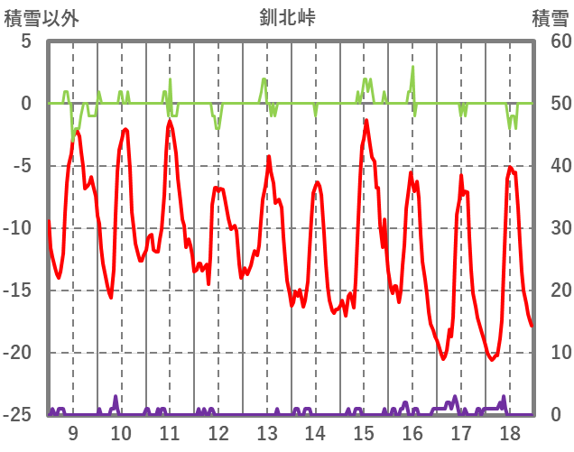 | 日 | 時 | 気温 | 降水 | 風向/風速 | 日照 | 積雪 | 降雪 |
