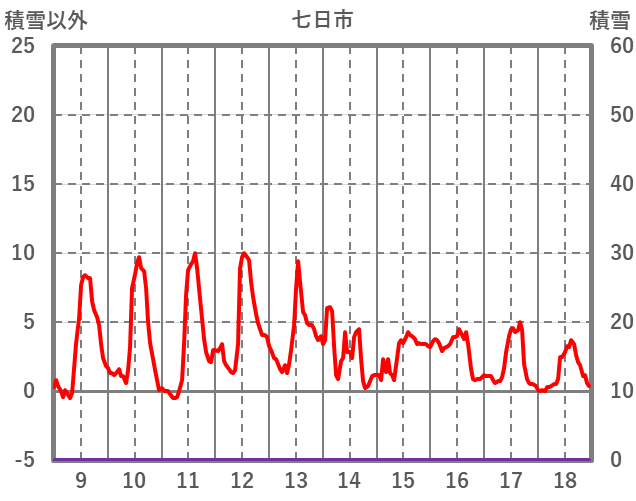 | 日 | 時 | 気温 | 降水 | 風向/風速 | 日照 | 積雪 | 降雪 |