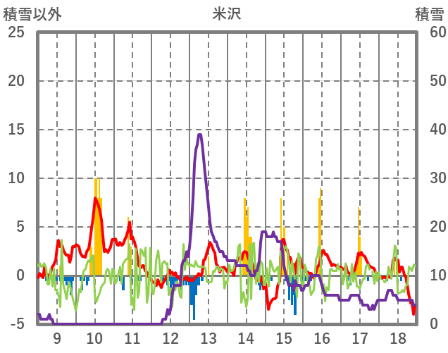 | 日 | 時 | 気温 | 降水 | 風向/風速 | 日照 | 積雪 | 降雪 |