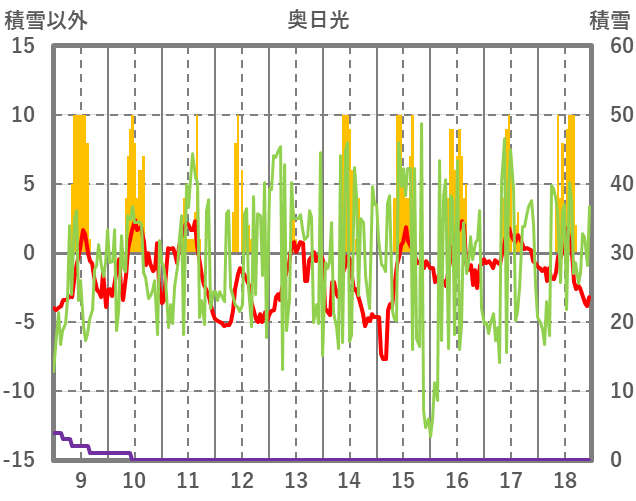 | 日 | 時 | 気温 | 降水 | 風向/風速 | 日照 | 積雪 | 降雪 |