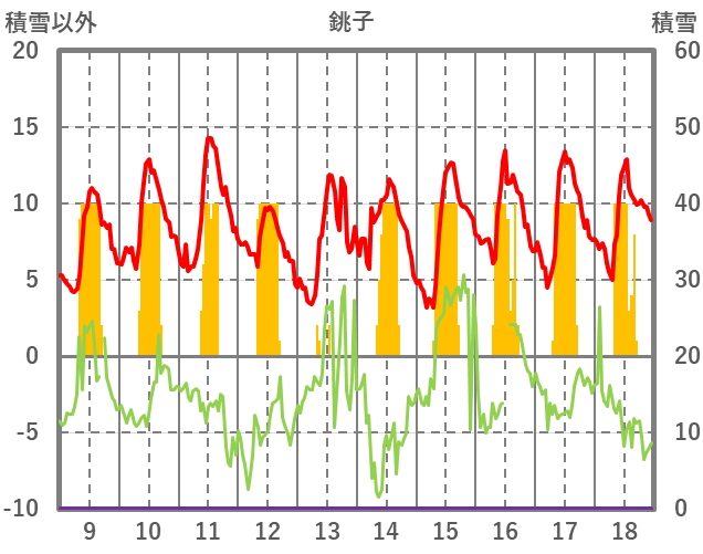 | 日 | 時 | 気温 | 降水 | 風向/風速 | 日照 | 積雪 | 降雪 |