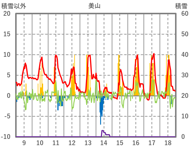 | 日 | 時 | 気温 | 降水 | 風向/風速 | 日照 | 積雪 | 降雪 |