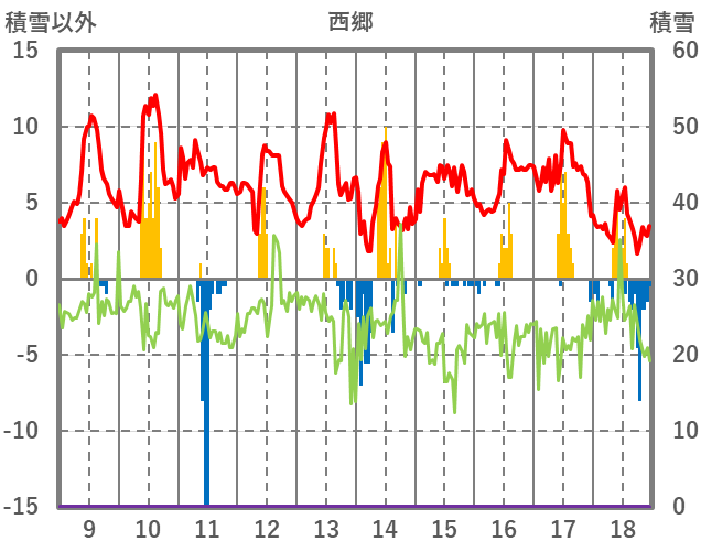 | 日 | 時 | 気温 | 降水 | 風向/風速 | 日照 | 積雪 | 降雪 |