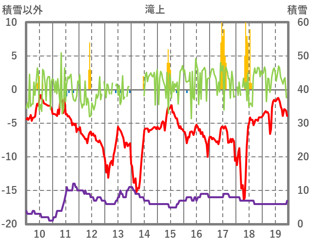 | 日 | 時 | 気温 | 降水 | 風向/風速 | 日照 | 積雪 | 降雪 |