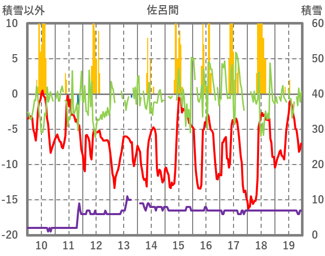 | 日 | 時 | 気温 | 降水 | 風向/風速 | 日照 | 積雪 | 降雪 |