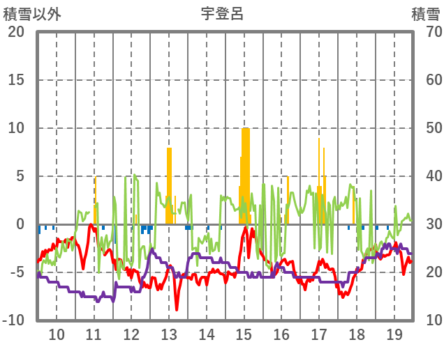 | 日 | 時 | 気温 | 降水 | 風向/風速 | 日照 | 積雪 | 降雪 |