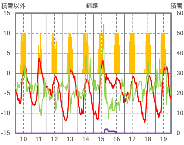 | 日 | 時 | 気温 | 降水 | 風向/風速 | 日照 | 積雪 | 降雪 |