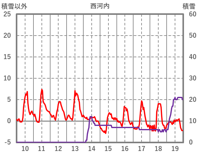 | 日 | 時 | 気温 | 降水 | 風向/風速 | 日照 | 積雪 | 降雪 |