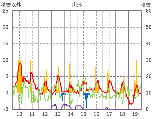| 日 | 時 | 気温 | 降水 | 風向/風速 | 日照 | 積雪 | 降雪 |