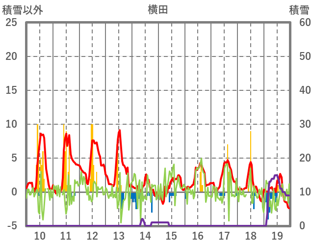 | 日 | 時 | 気温 | 降水 | 風向/風速 | 日照 | 積雪 | 降雪 |
