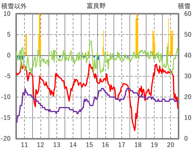 | 日 | 時 | 気温 | 降水 | 風向/風速 | 日照 | 積雪 | 降雪 |