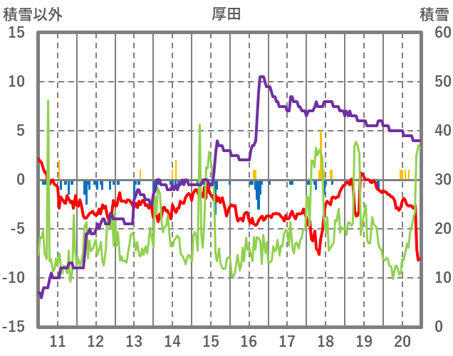 | 日 | 時 | 気温 | 降水 | 風向/風速 | 日照 | 積雪 | 降雪 |