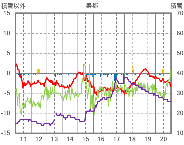 | 日 | 時 | 気温 | 降水 | 風向/風速 | 日照 | 積雪 | 降雪 |