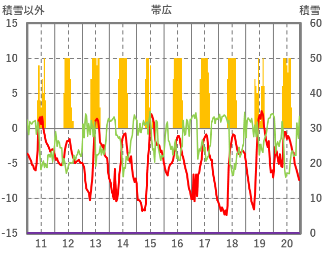 | 日 | 時 | 気温 | 降水 | 風向/風速 | 日照 | 積雪 | 降雪 |