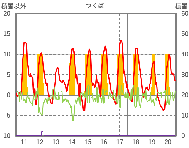 | 日 | 時 | 気温 | 降水 | 風向/風速 | 日照 | 積雪 | 降雪 |