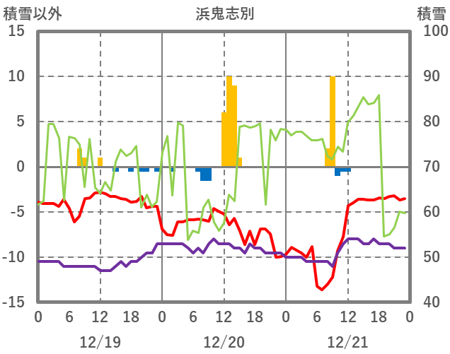 | 日 | 時 | 気温 | 降水 | 風向/風速 | 日照 | 積雪 | 降雪 |