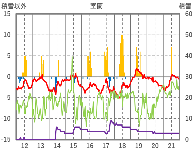 | 日 | 時 | 気温 | 降水 | 風向/風速 | 日照 | 積雪 | 降雪 |