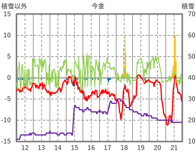 | 日 | 時 | 気温 | 降水 | 風向/風速 | 日照 | 積雪 | 降雪 |