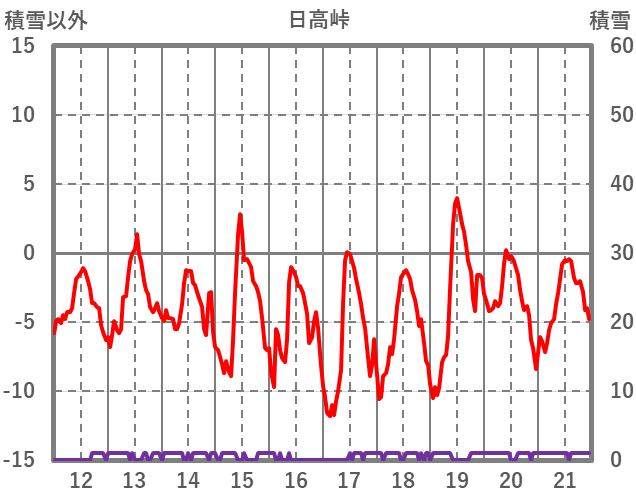 | 日 | 時 | 気温 | 降水 | 風向/風速 | 日照 | 積雪 | 降雪 |