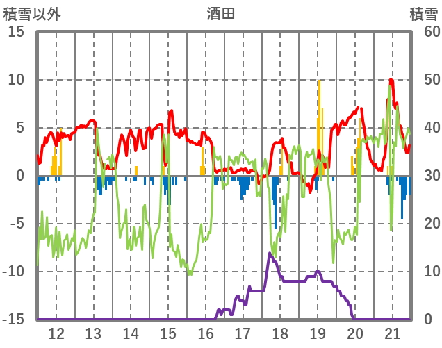 | 日 | 時 | 気温 | 降水 | 風向/風速 | 日照 | 積雪 | 降雪 |