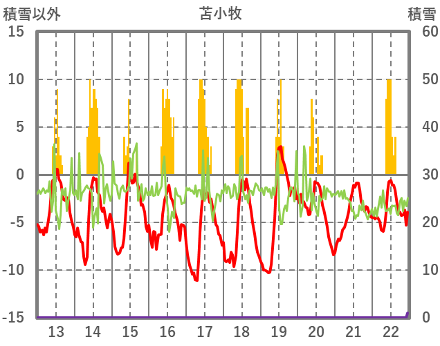 | 日 | 時 | 気温 | 降水 | 風向/風速 | 日照 | 積雪 | 降雪 |