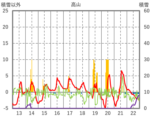 | 日 | 時 | 気温 | 降水 | 風向/風速 | 日照 | 積雪 | 降雪 |