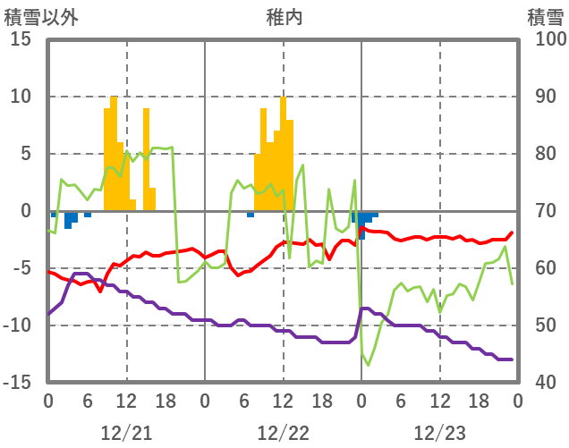 | 日 | 時 | 気温 | 降水 | 風向/風速 | 日照 | 積雪 | 降雪 |
