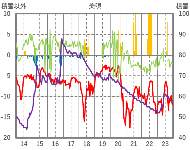 | 日 | 時 | 気温 | 降水 | 風向/風速 | 日照 | 積雪 | 降雪 |