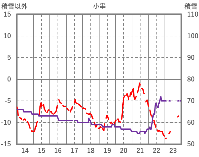 | 日 | 時 | 気温 | 降水 | 風向/風速 | 日照 | 積雪 | 降雪 |