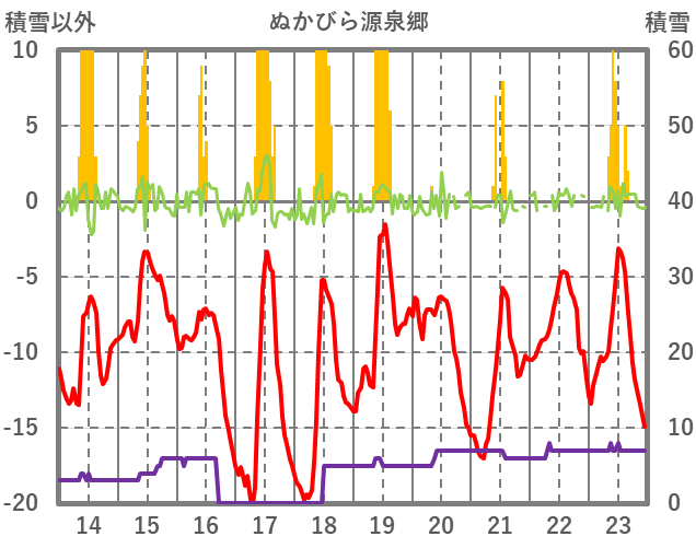 | 日 | 時 | 気温 | 降水 | 風向/風速 | 日照 | 積雪 | 降雪 |