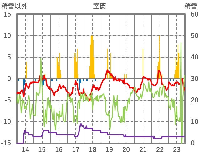 | 日 | 時 | 気温 | 降水 | 風向/風速 | 日照 | 積雪 | 降雪 |
