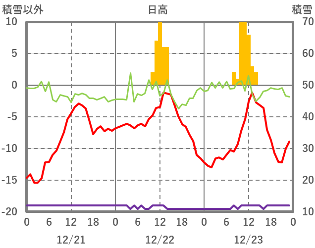 | 日 | 時 | 気温 | 降水 | 風向/風速 | 日照 | 積雪 | 降雪 |