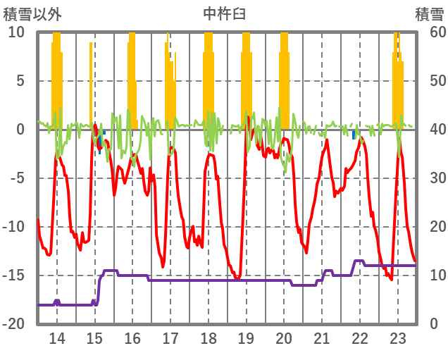 | 日 | 時 | 気温 | 降水 | 風向/風速 | 日照 | 積雪 | 降雪 |