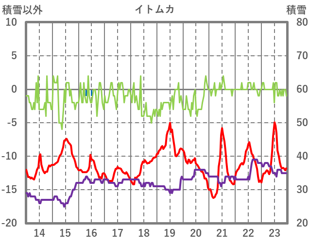 | 日 | 時 | 気温 | 降水 | 風向/風速 | 日照 | 積雪 | 降雪 |