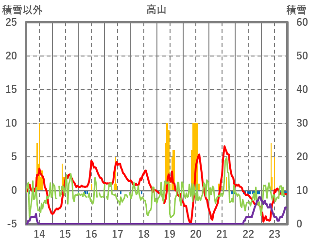 | 日 | 時 | 気温 | 降水 | 風向/風速 | 日照 | 積雪 | 降雪 |