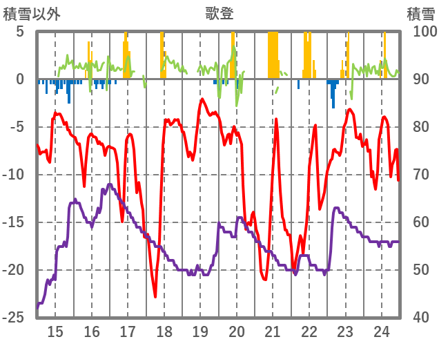 | 日 | 時 | 気温 | 降水 | 風向/風速 | 日照 | 積雪 | 降雪 |