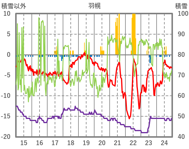 | 日 | 時 | 気温 | 降水 | 風向/風速 | 日照 | 積雪 | 降雪 |