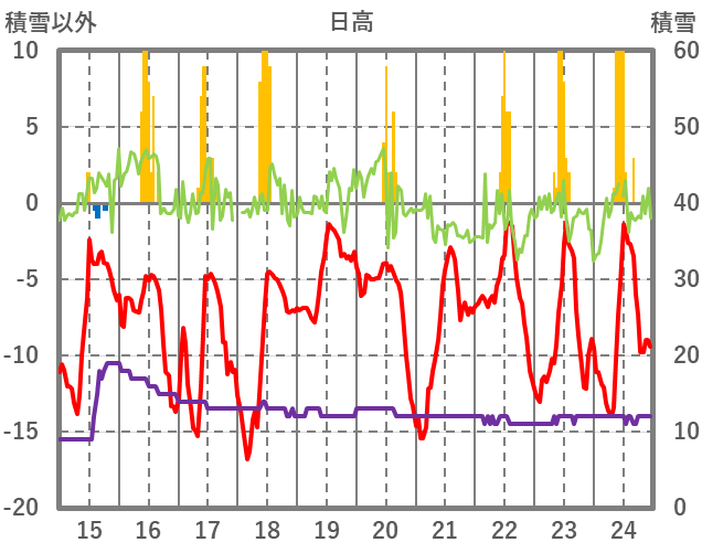 | 日 | 時 | 気温 | 降水 | 風向/風速 | 日照 | 積雪 | 降雪 |