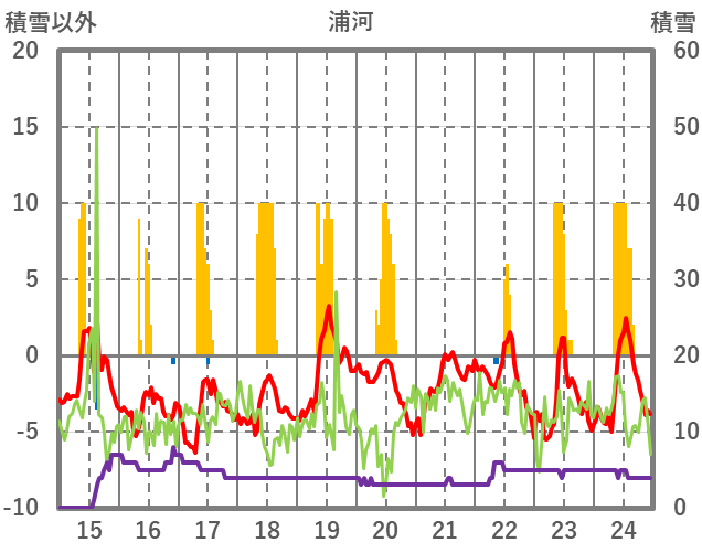 | 日 | 時 | 気温 | 降水 | 風向/風速 | 日照 | 積雪 | 降雪 |