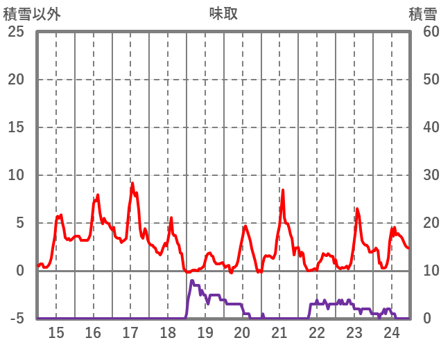 | 日 | 時 | 気温 | 降水 | 風向/風速 | 日照 | 積雪 | 降雪 |