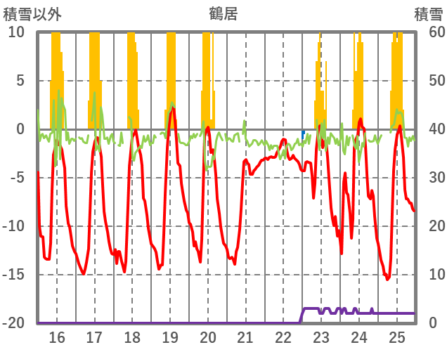 | 日 | 時 | 気温 | 降水 | 風向/風速 | 日照 | 積雪 | 降雪 |