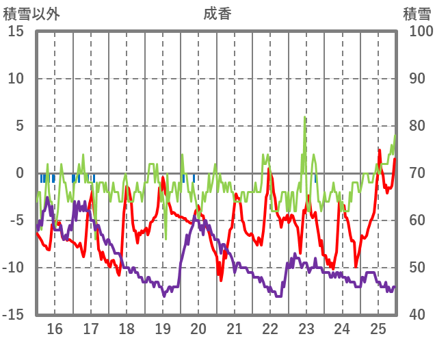 | 日 | 時 | 気温 | 降水 | 風向/風速 | 日照 | 積雪 | 降雪 |