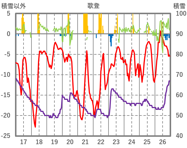 | 日 | 時 | 気温 | 降水 | 風向/風速 | 日照 | 積雪 | 降雪 |