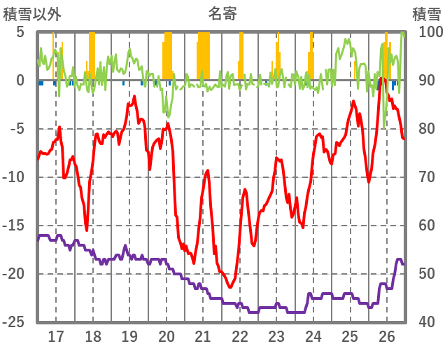 | 日 | 時 | 気温 | 降水 | 風向/風速 | 日照 | 積雪 | 降雪 |