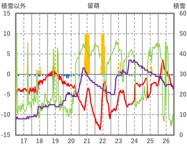 | 日 | 時 | 気温 | 降水 | 風向/風速 | 日照 | 積雪 | 降雪 |