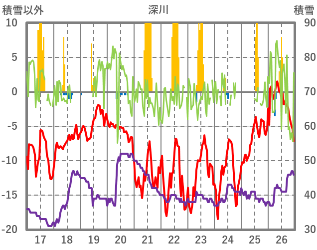 | 日 | 時 | 気温 | 降水 | 風向/風速 | 日照 | 積雪 | 降雪 |