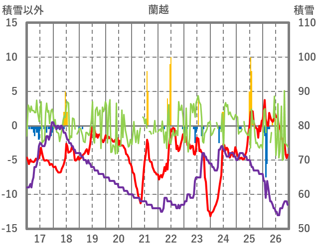 | 日 | 時 | 気温 | 降水 | 風向/風速 | 日照 | 積雪 | 降雪 |